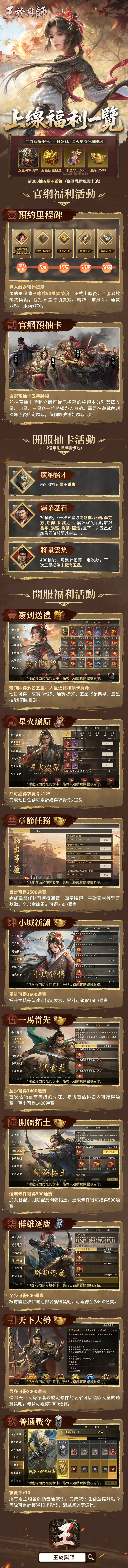 兵馬未動、糧草先行,我們為各位君主準備了豐厚的戰備物資,完成系列活動和任務即可領取。開服七日可得五星將領典韋*1、五星技能自選*1、求賢令*150、通寶*2500等豐厚獎勵!福利活動資訊彙總如下,請君主查收。